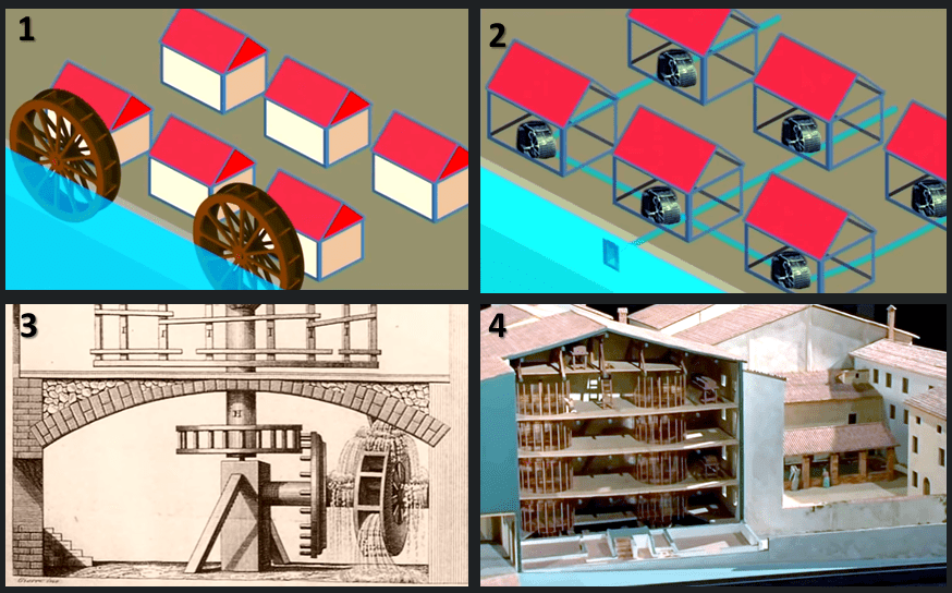 Processo evolutivo dalle grandi ruote a pale ai piccoli mulini a cassetti.