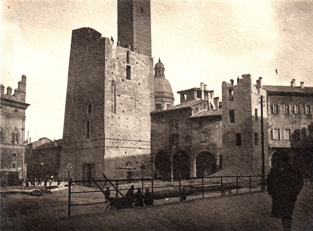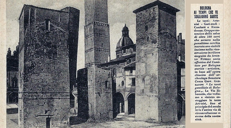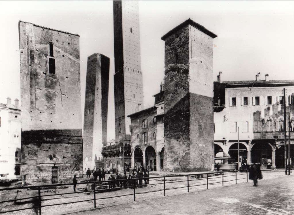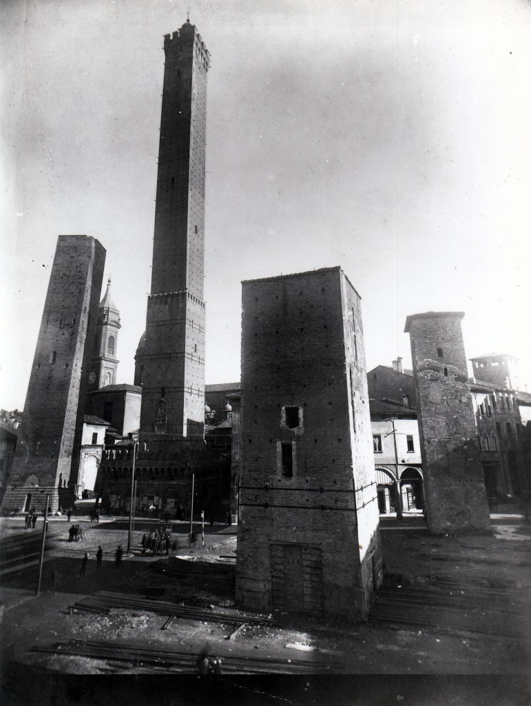 Foto seguente: in primo piano, le tre torri demolite dopo aspre polemiche: Artenisi, Conforti-Guidozagni e Riccadonna. Sullo sfondo le Torri Garisenda e Asinelli (fonte: torridibologna.it).