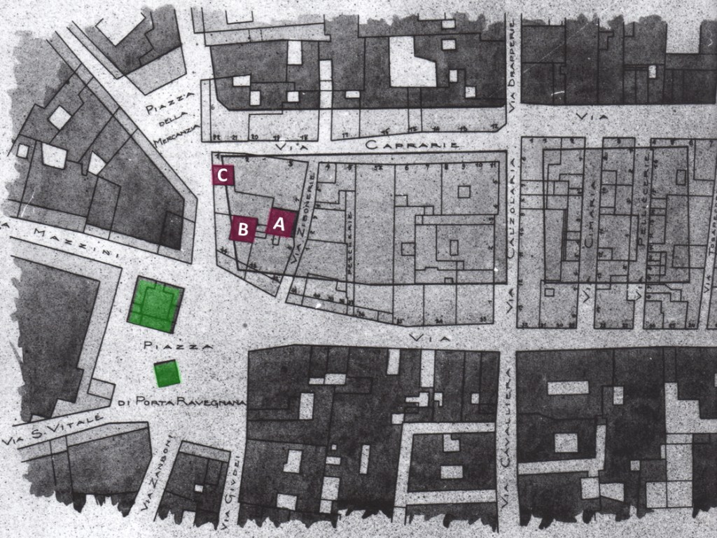 Mappa seguente: torri Artenisi (A), Conforti-Guidozagni (B) e Riccadonna (C).
