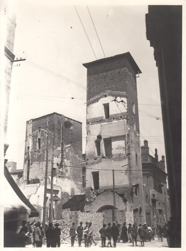 La costruzione dei primi due lotti era terminata. Li separava la nuova via degli Artieri che, allargata, aveva rimpiazzato il vicolo Tosapecore. Nel 1923 iniziarono le demolizioni del terzo lotto, quello ancora visibile nella prossima foto, e anch’esso avrebbe riservato sorprese… turrite.