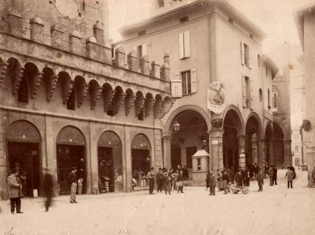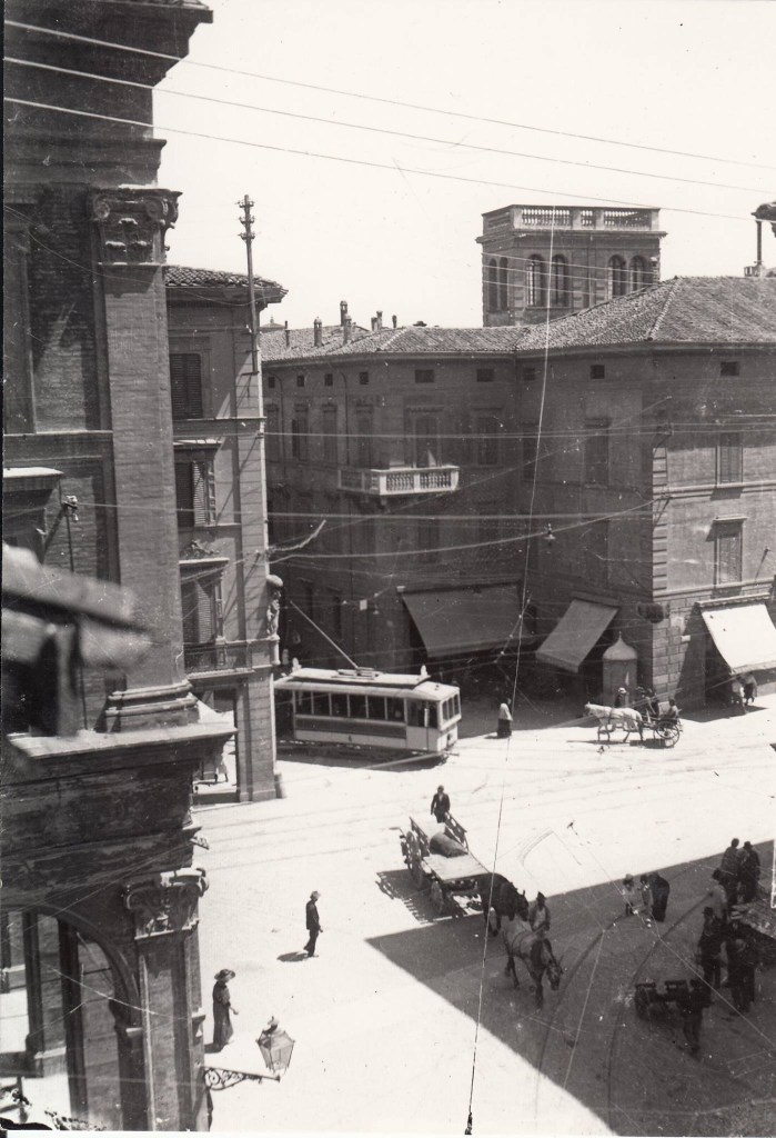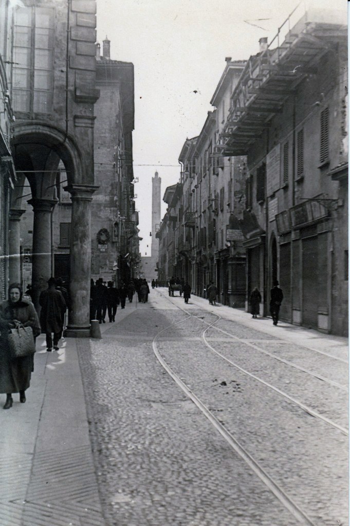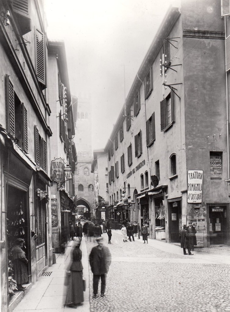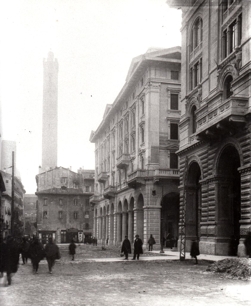 Con l’aiuto della prossima foto proseguiamo lungo via Ugo Bassi (non ancora allargata) fino alle Due Torri, per incontrare l’area del Mercato Di Mezzo.