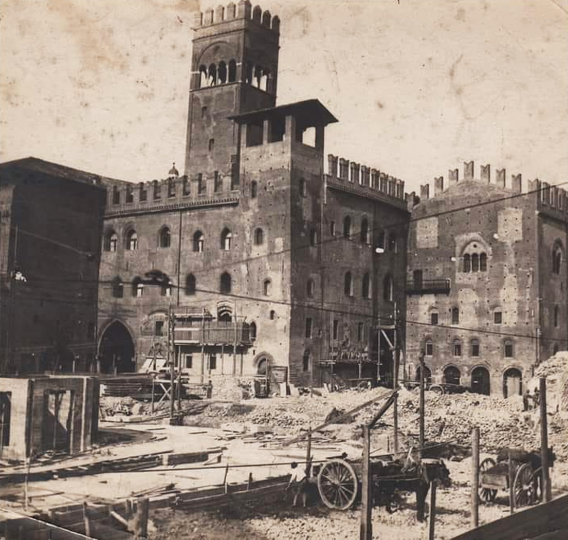 Foto seguenti: cantieri fra Palazzo Re Enzo e via Rizzoli nel 1913. Già scomparse Casa Campogrande, via della Corda, Cànepa, Spaderie, delle Accuse e piazza degli Uccelli. Il blocco Palazzo del Podestà/Palazzo Re Enzo torna così alla luce su ogni lato e diventa un isolato a sé stante (collezione Fausto Malpensa).