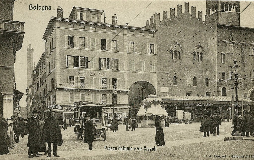 Foto seguenti: imbocco di via Rizzoli da piazza del Nettuno. In angolo a destra, Casa Campogrande (collezione Fausto Malpensa).