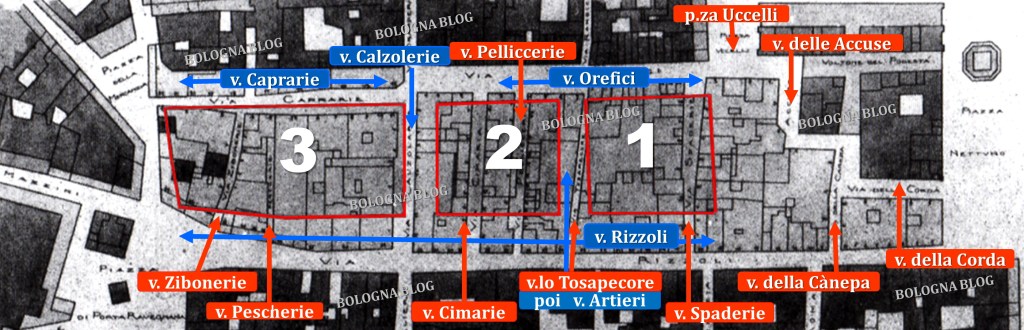 Nell’area del Mercato di Mezzo furono demoliti interi isolati per allargare e allineare le vie Rizzoli e Caprarie-Orefici (1914-16). Scomparvero invece altre più corte e anguste i cui nomi ricordavano le principali attività che le caratterizzavano.