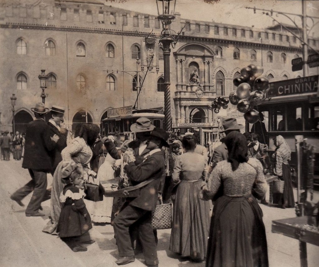 Foto seguenti: 1-2) Mercato in Piazza Maggiore, seconda metà dell’800 (collezione Fausto Malpensa). 3) Via Rizzoli anni ’20 (fonte: Cineteca di Bologna).