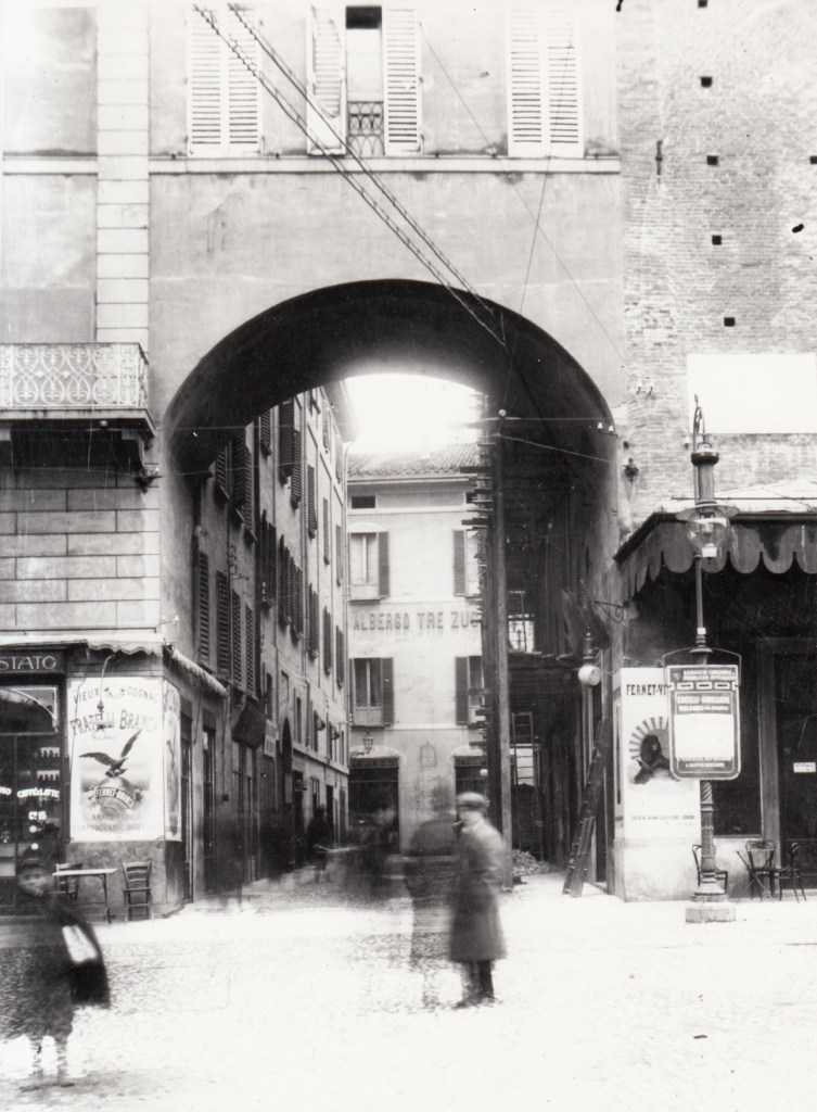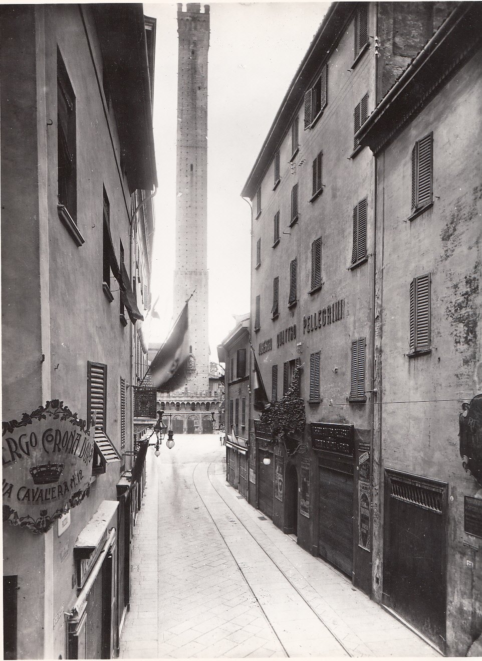 Sotto: tratto finale verso le Due Torri. Tutto il lato destro, dove spicca l’insegna dell’albergo Quattro Pellegrini, sarà demolito per consentire l’allargamento della strada. A sinistra, targa dell’albergo Corona d’Oro in angolo con via Cavaliera, poi rinominata via Oberdan. Sotto la torre Asinelli si allarga piazza Ravegnana (collezione Fausto Malpensa).