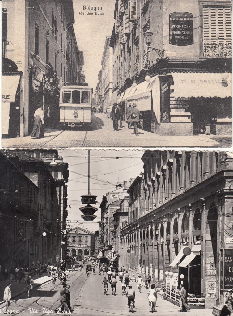 Foto seguenti: 1-2) Via Ugo Bassi prima e dopo l’allargamento, agli inizi del ‘900 e negli anni ’50. 3) Incrocio via Ugo Bassi-Marconi / S. Felice-p.za Malpighi. Il tram proviene da via Roma (poi Marconi), non ancora allargata, e sta svoltando in via Ugo Bassi (collezione Fausto Malpensa).