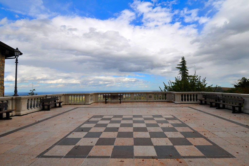 Il campanile color ocra si erge sulla collina, circondato dalle case dell’antico borgo che si affaccia sulla valle sottostante.