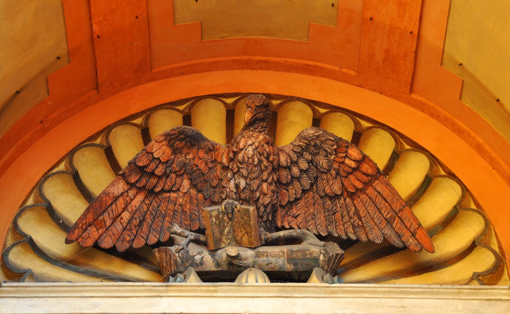 Due aquile in terracotta sono collocate sotto un finestrone di arenaria del Palazzo d’Accursio: quella di sinistra è attribuita a Michelangelo Buonarroti, mentre quella di destra è di Niccolò dell’Arca.
