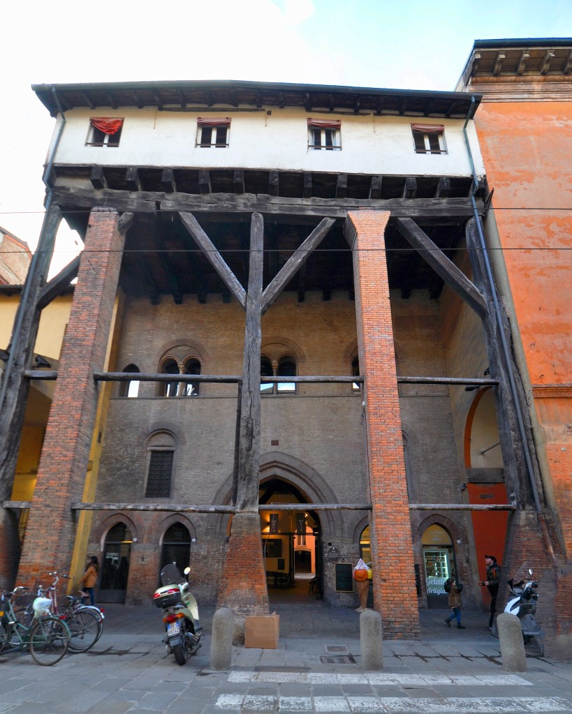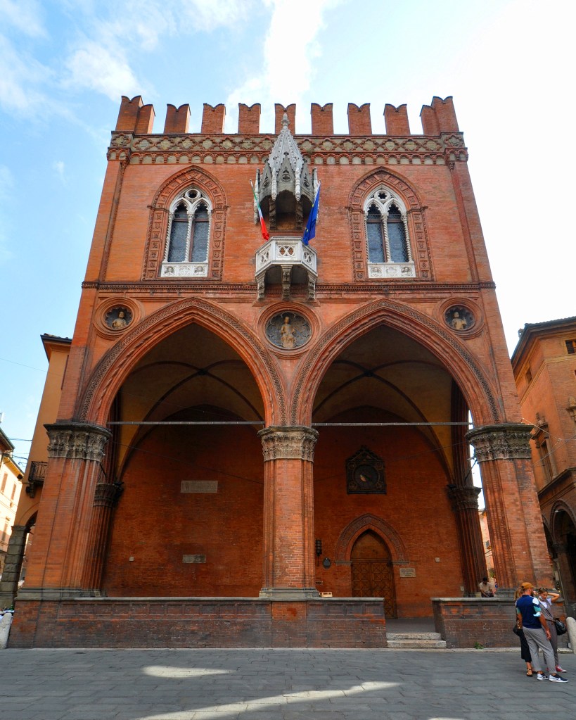 Ritorniamo al punto di partenza. In piazza di Porta Ravegnana n. 1 troviamo il Palazzo dei Drappieri, edificato tra il 1486 e il 1496 per la Corporazione dei drappieri, detti Strazzaroli.
