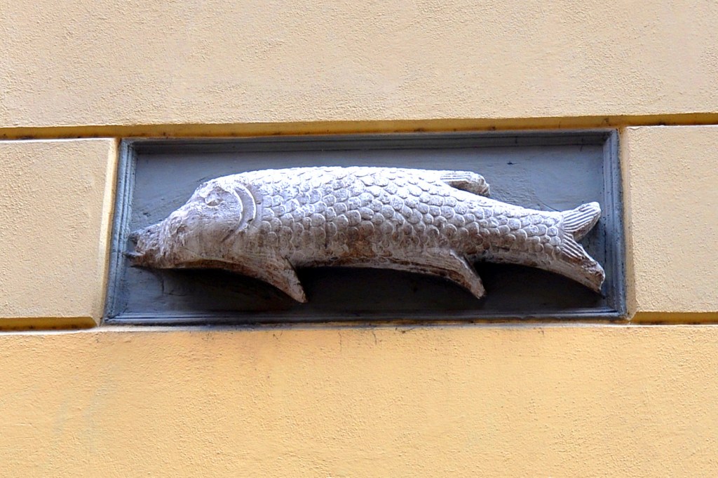 Proseguendo per via Santo Stefano, il primo vicolo sulla sinistra è via del Luzzo, dove si trova un’insegna figurata raffigurante un luccio. A Bologna esistono altre due insegne simili, probabilmente pensate in passato per chi non sapeva leggere: il riccio in via del Riccio e la testa in via del Cane.