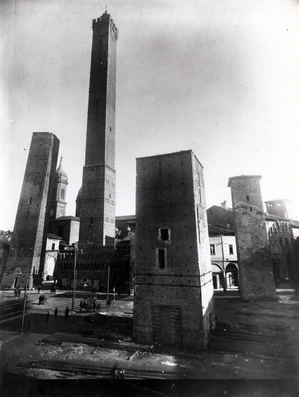Quattro delle cinque torri nell’antico Mercato di Mezzo (Garisenda, Asinelli, Guidozagni, Artemisi. Più a destra, esclusa dall’inquadratura, torre Riccadonna vicina al Palazzo della Mercanzia).